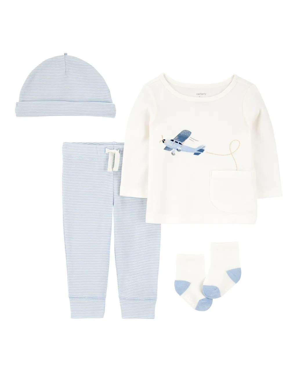 Whether it's tummy time or takeoff time, this 4-piece outfit set is ready to go. Featuring a playful airplane graphic tee, striped joggers, socks and a matching hat, it's got everything you need to keep your baby looking sharp and comfy. Parents will appreciate the easy pull-on pants and cozy cotton feel, while babies enjoy the all-day comfort - and maybe a few coos about that plane.SKU # 11994081012